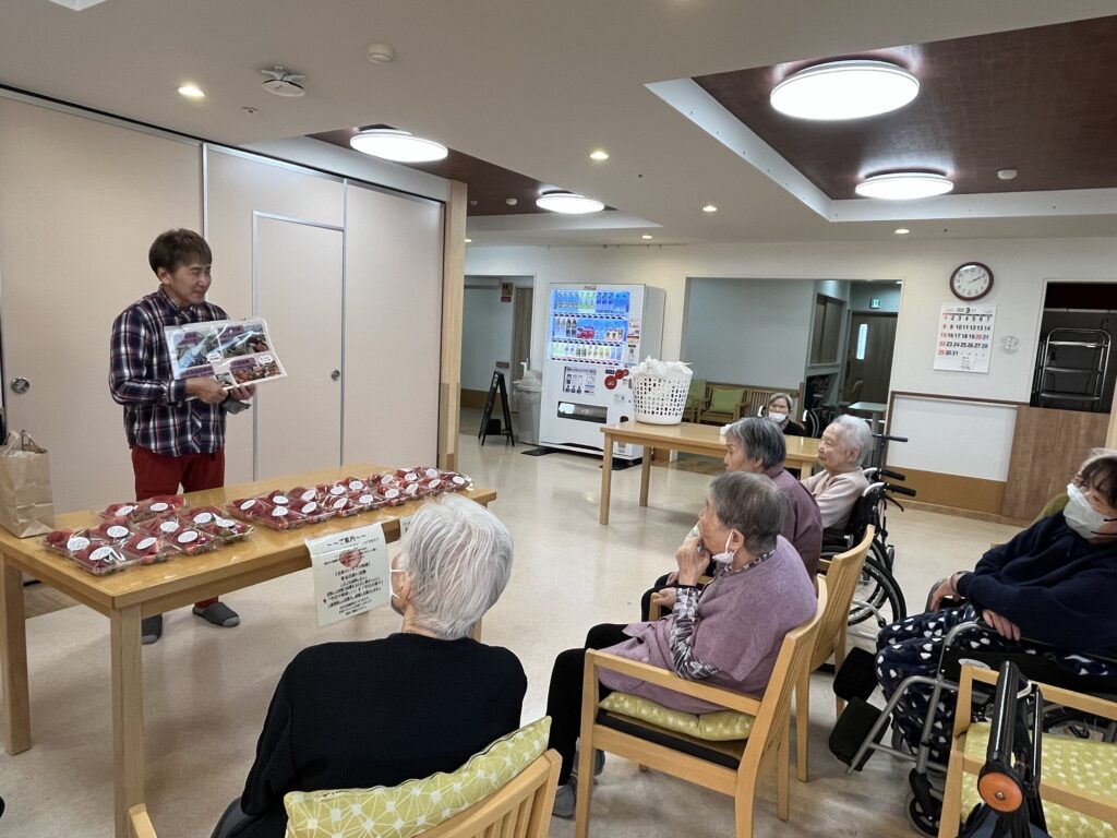 職員がいちごのお話を紙芝居風にお客様に伝えてから販売会がスタートです。