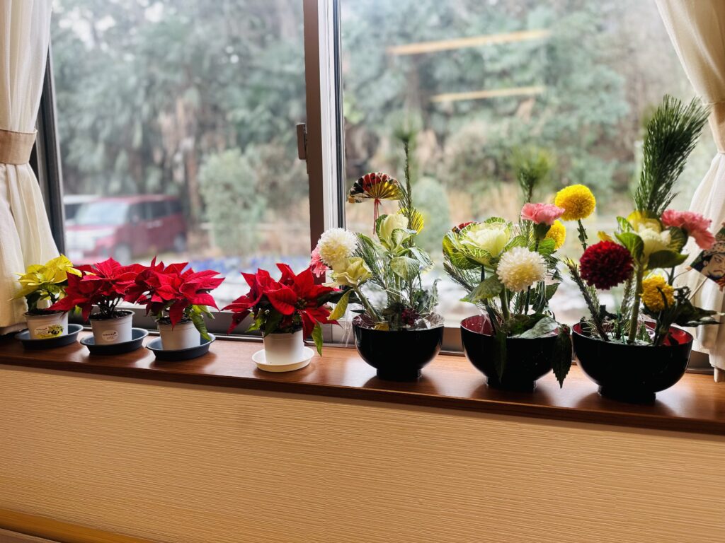 また、窓際には水やりをしたお正月のお花のアレンジメントやポインセチアを並べ、冬のやわらかな日差しの中で華やかな彩りを楽しみました😌😌😌👐