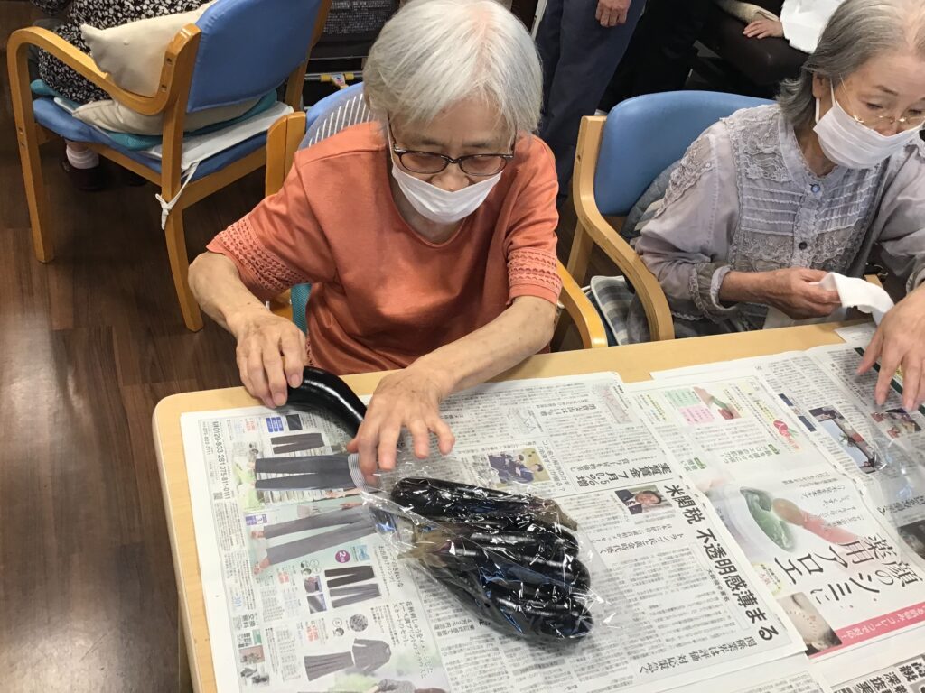 本日は、農園に機能訓練兼ねてナスの収穫をしました。茄子は、成長が早く本日はカゴにいっぱい収穫できました。