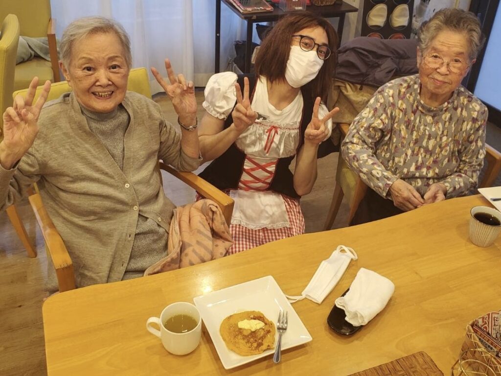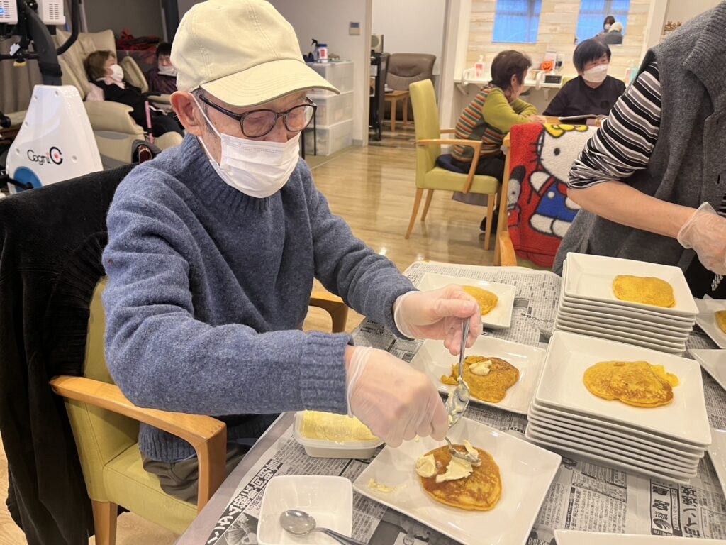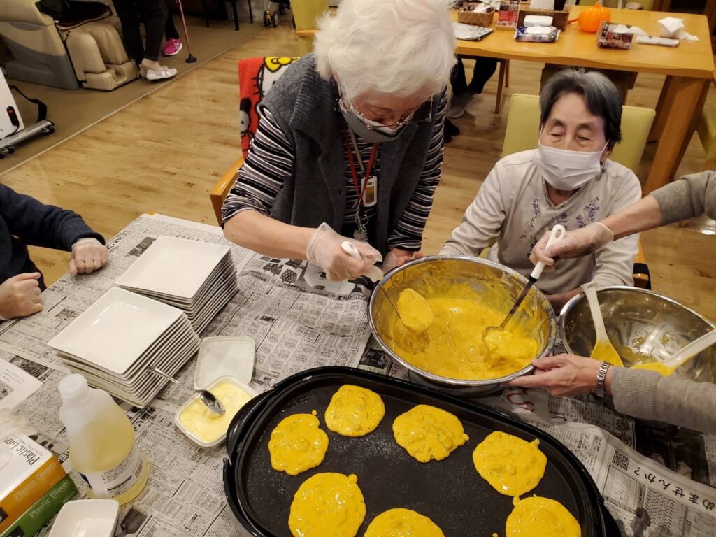 おやつはお客様と一緒にカボチャのホットケーキを手作りしました。