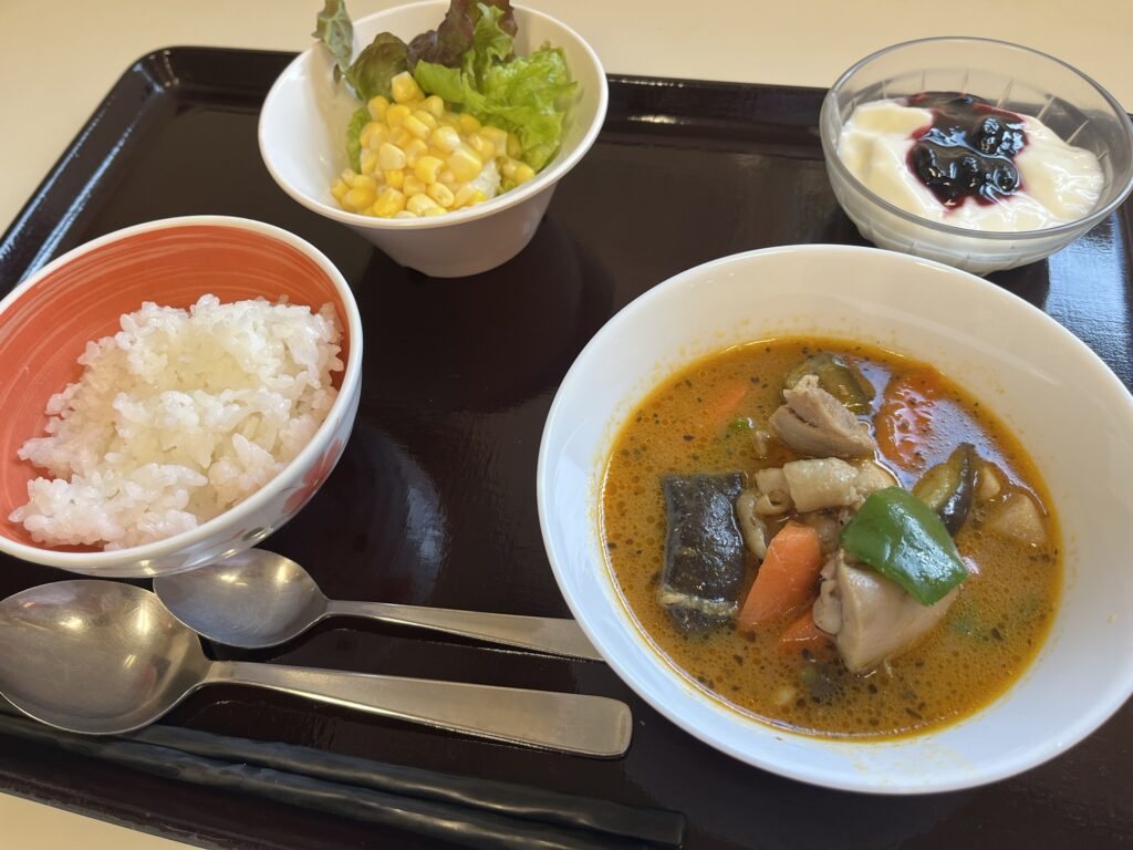 本日、食+でした!メニューは、スープカレー、ポテトサラダ、ハスカップヨーグルトです(´∀`*)