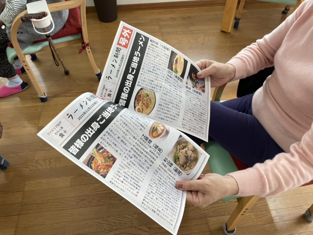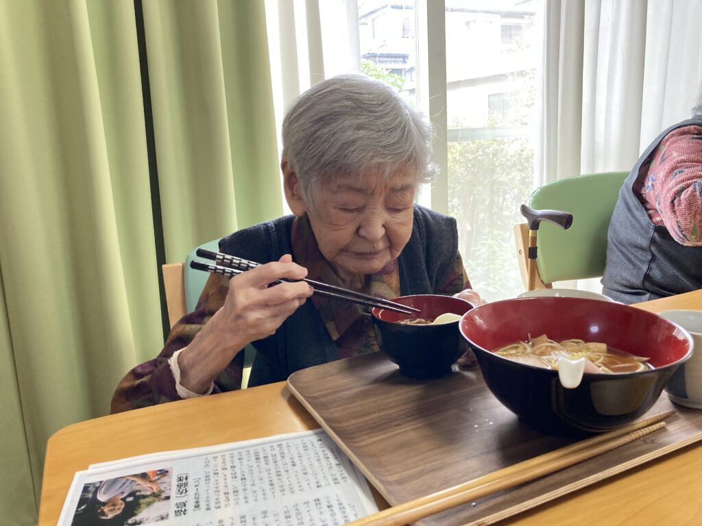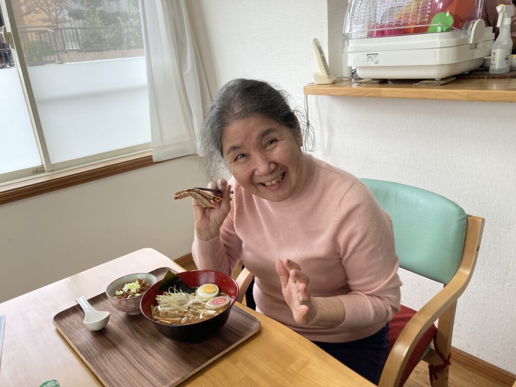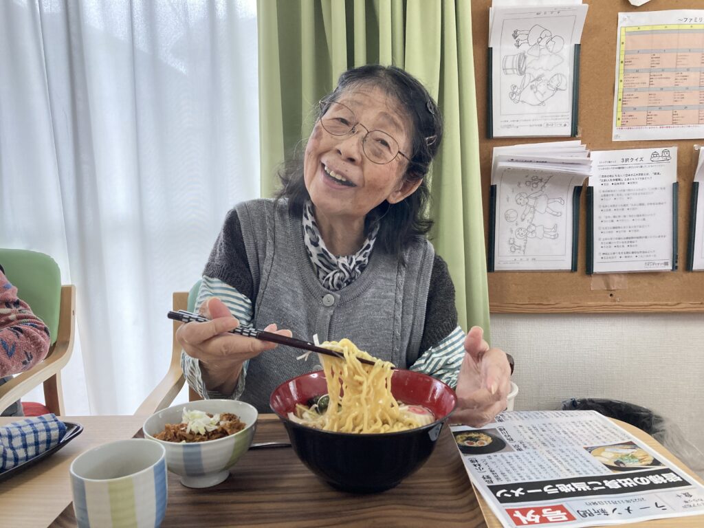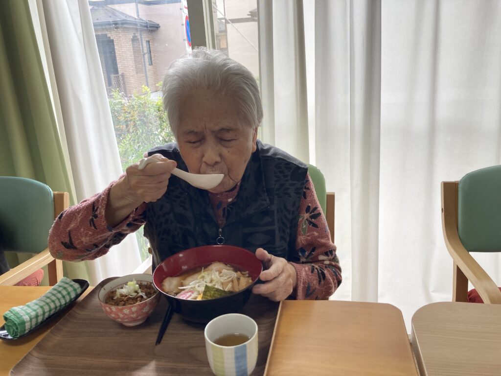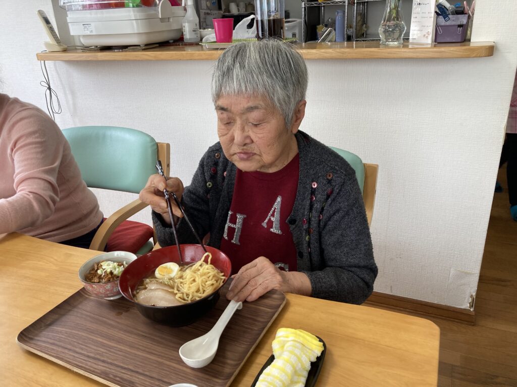 朝の送迎時より今日はラーメン🍜だよねと、とても楽しみにしてくださっていて昼食のラーメンをとても楽しみにされていました。まず汁を一口美味しいと😋麺を啜るとさらに美味しい皆さん箸🥢が止まりませんでした。帰りの送迎時にも忘れならないラーメンだったと、皆さん喜ばれていました😀